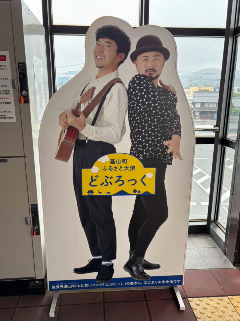 ちなみに基山は、お笑いコンビ「どぶろっく」のお二人の出身地ということらしいです。観光大使にも任命されているそうで、駅にもお二人のパネルが設置されていました。