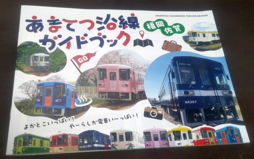 甘木鉄道沿線マップの表紙をみると、甘木鉄道はすべての車体のカラーリングが違うようです。甘木駅の構内にも、カラフルな車両が留置されていました。