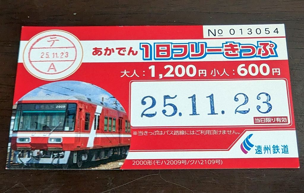 今回は予定があり天浜線を乗りつぶす時間がとれなかったため、遠州鉄道のみの一日乗車券(1200円)を利用しました。全線を通して乗車すると510円なので、2回以上途中下車するときっぷを購入するよりもお得になる計算です。