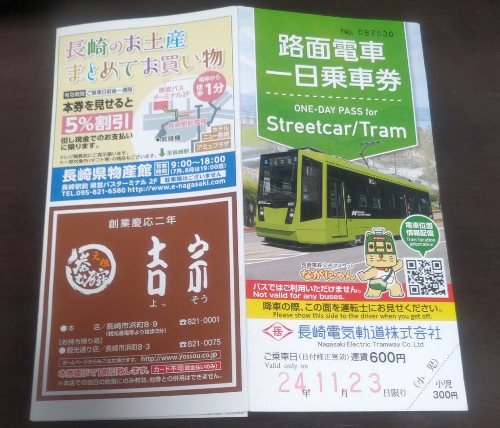 路面電車の一日乗車券は車内でも購入できる場合が多いですが、長崎電気軌道では車内販売はないので乗車前に購入しておく必要があります。私はJR長崎駅構内の観光案内所で購入しました。