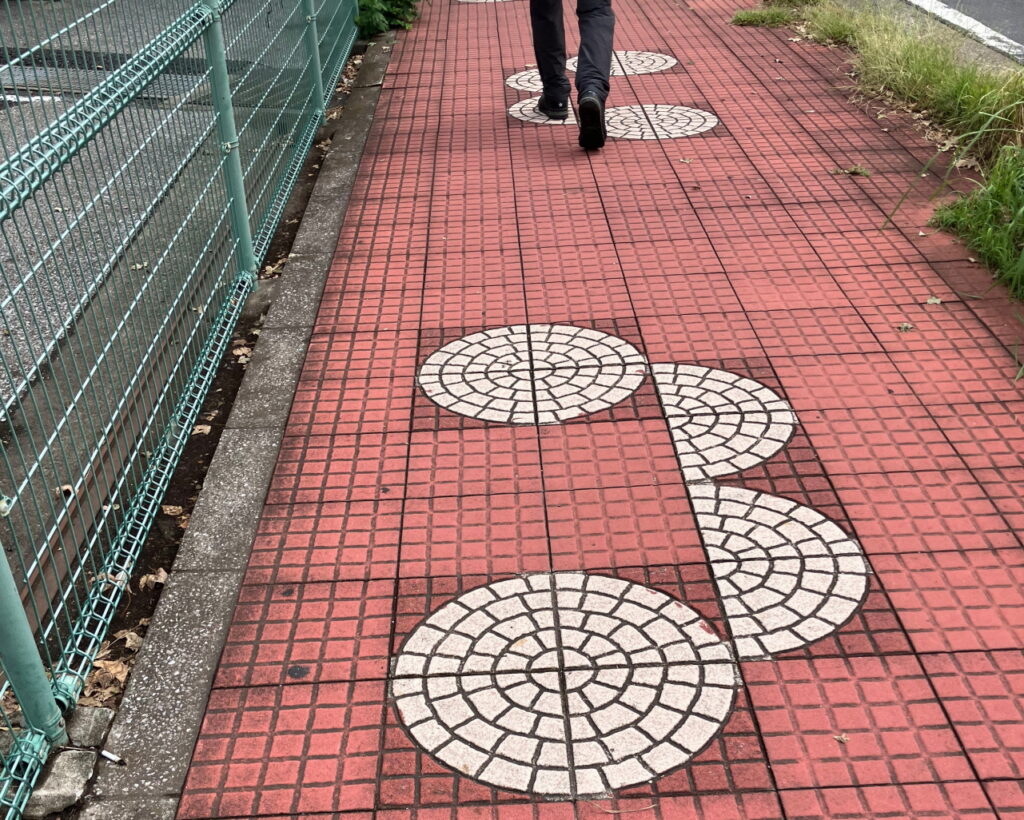 青木町公園から三ツ和公園までは3kmほど。昨年は40kmコースのショートカットルートとして設定されていた区間です。途中、オートレース場の前を通りますが、歩道も敷石もバイクの形です。