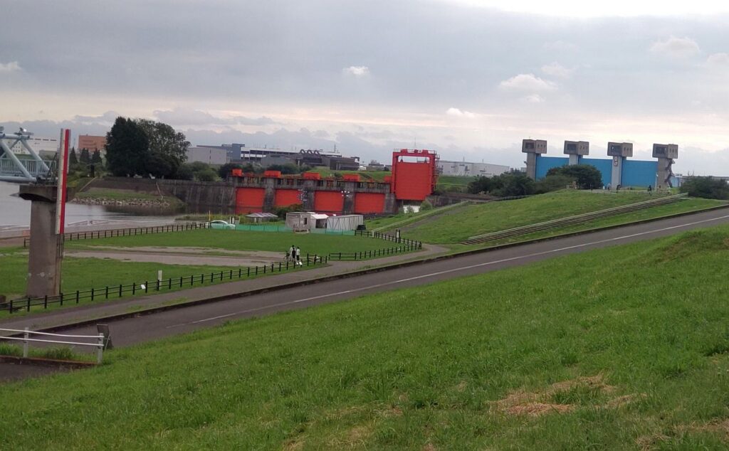 スタート地点でもある岩淵水門の最寄り駅は、地下鉄南北線の赤羽岩淵駅です。駅を出て1kmほどで荒川の土手に到着。目の前に新旧の岩淵水門が現れます。赤が旧水門、青が新水門で、この青色の新水門の中央部分をスタート地点としてみました。
