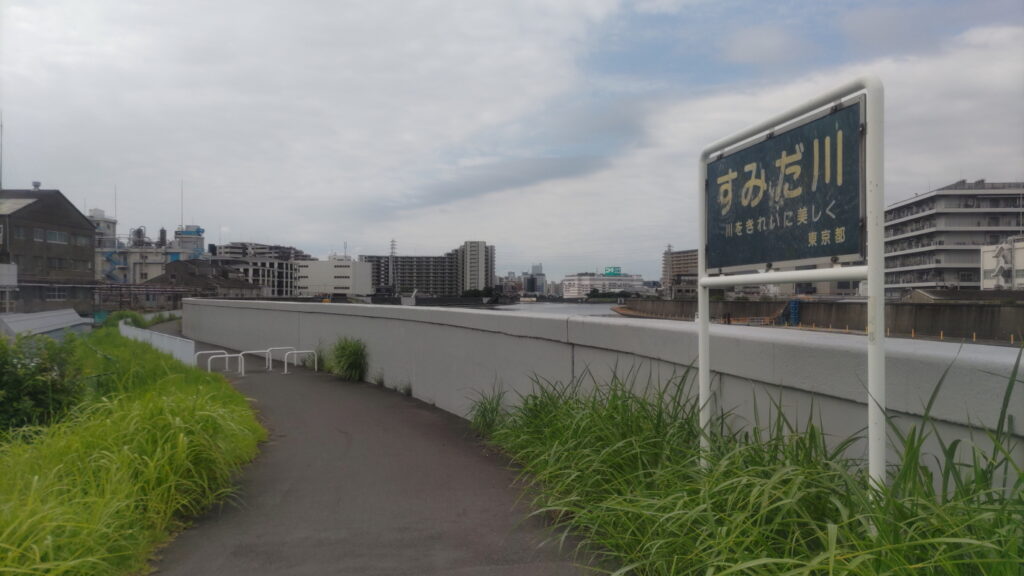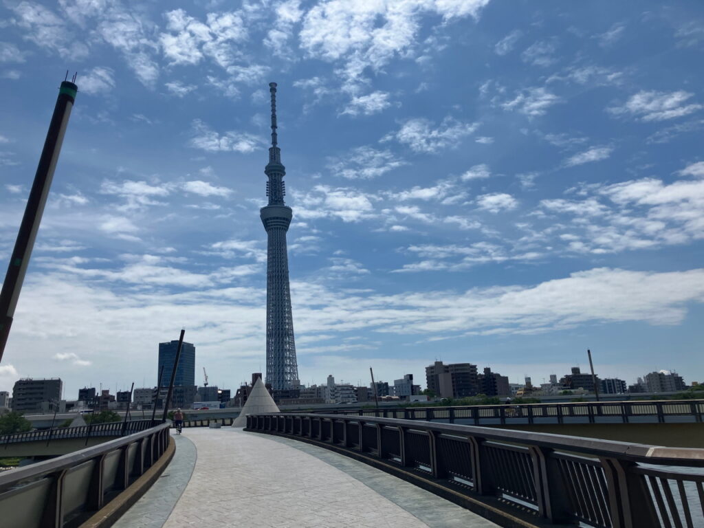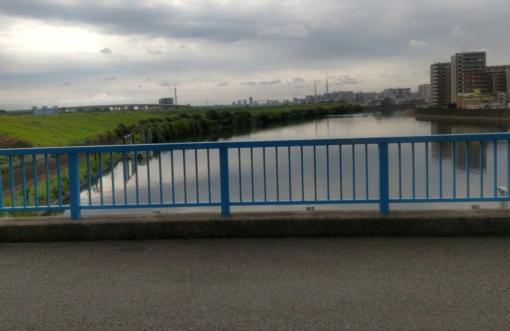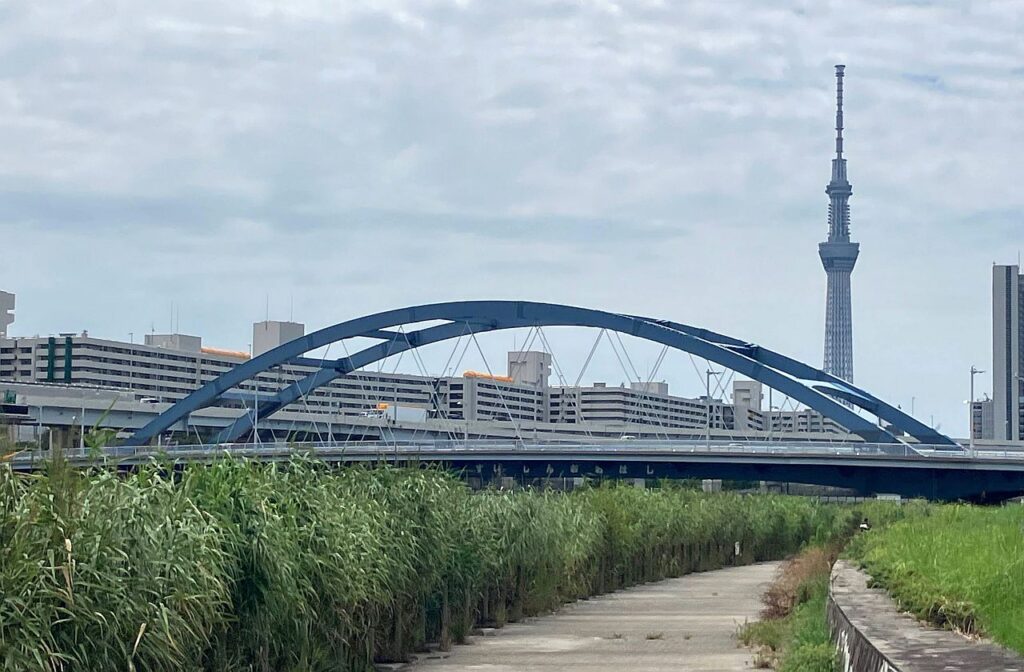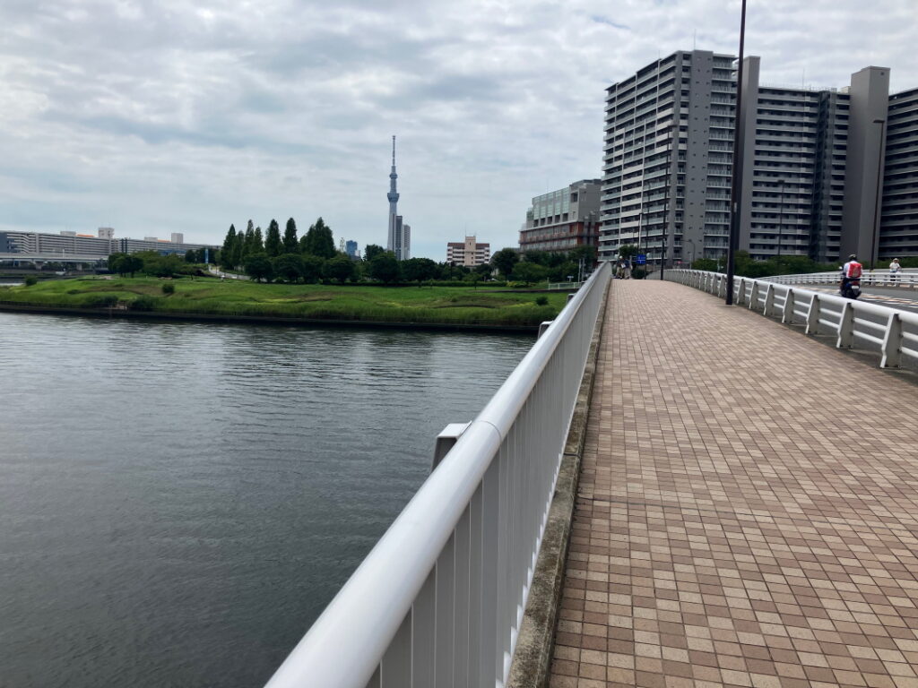 千住汐入大橋を渡ったところがこのコース全体のほぼ中間地点。ここからしばらくはスカイツリーがよく見える区間となります。