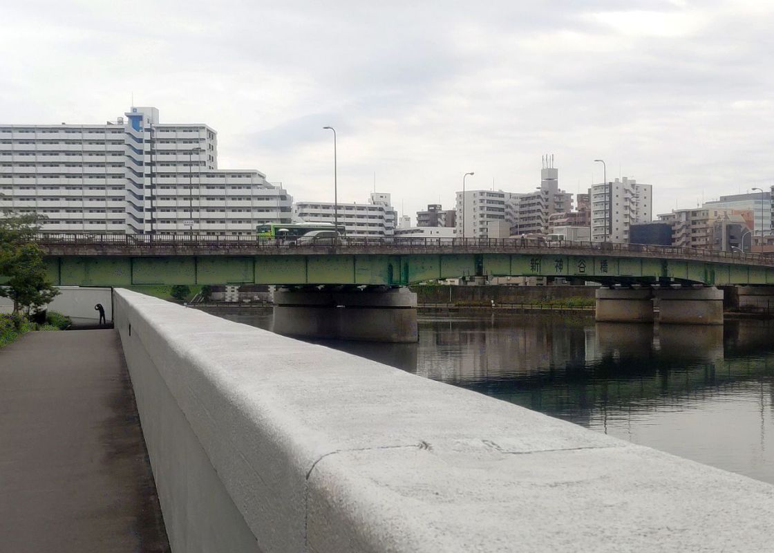 新岩淵水門からしばらくは隅田川の左岸(下流に向かって左側)に整備されている歩道を歩きます。荒川と離れると一旦川と歩道の間は高い壁に区切られ、川が見えなくなりますが、隅田川の上流から2番目の橋である新神谷橋が近づくころには、また川が見えるようになってきます。