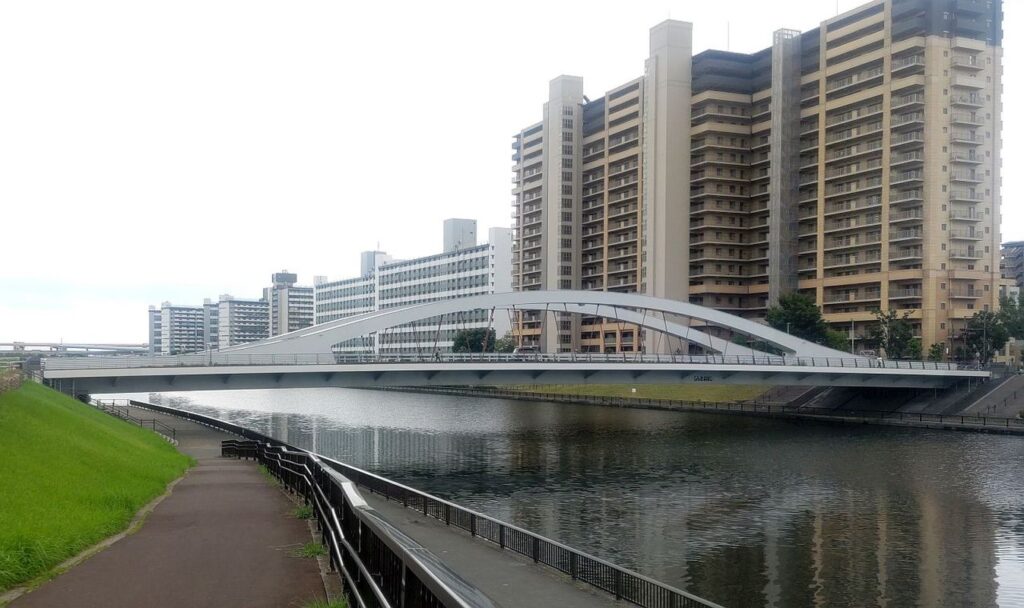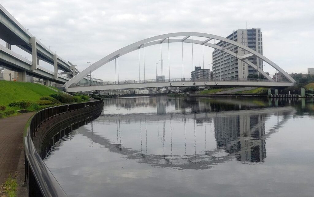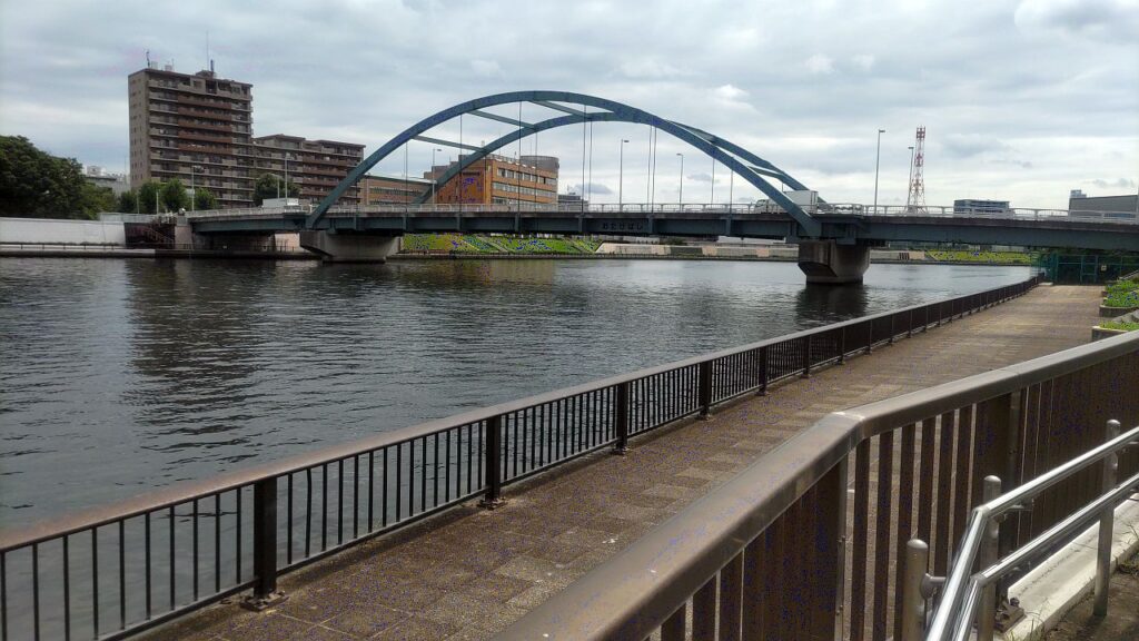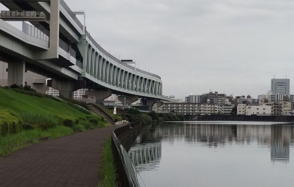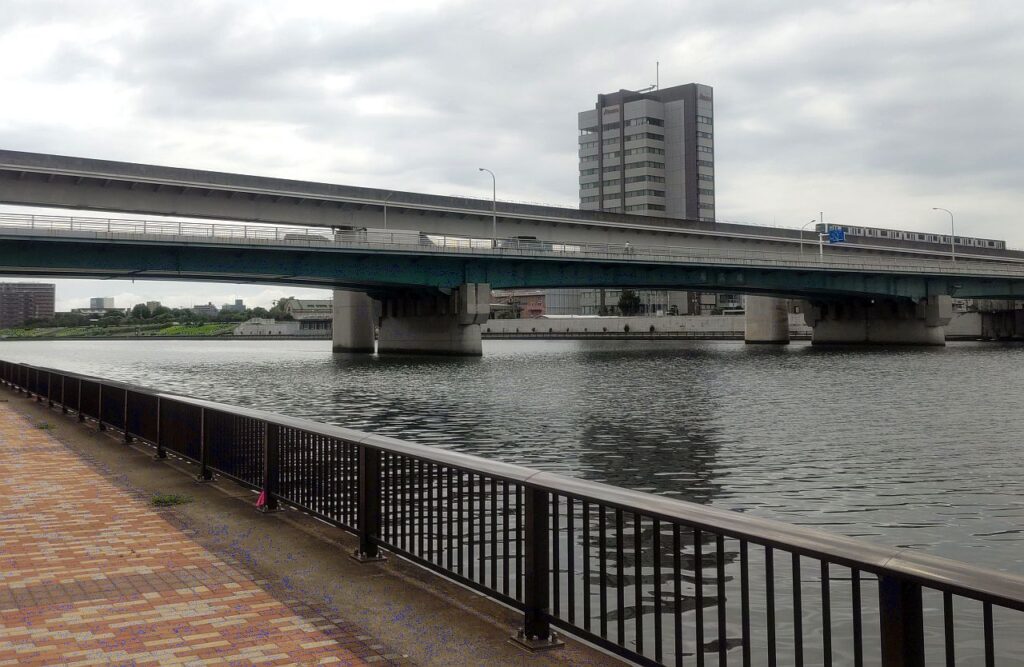 新田橋をすぎると、左岸の川沿いにテラスが整備された区間になり新豊橋をくぐります。豊島橋をくぐると遠くに隅田川を渡る首都高中央環状線みえてきます。この首都高中央環状線が通る区間は左岸、右岸とも隅田川沿いを歩くことができません。「足立区立宮城ファミリー公園」のところで左岸側のテラスが切れるので、公園を通り抜けて一般道へ。そこから「みやぎ水再生センター」の建物沿いに進むと再び隅田川沿いの歩道にぶつかります。