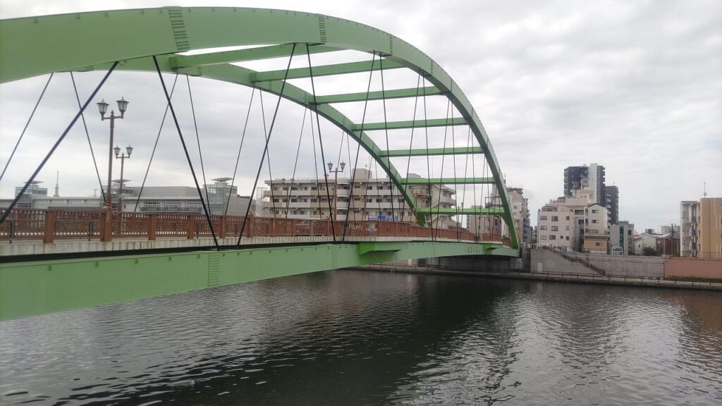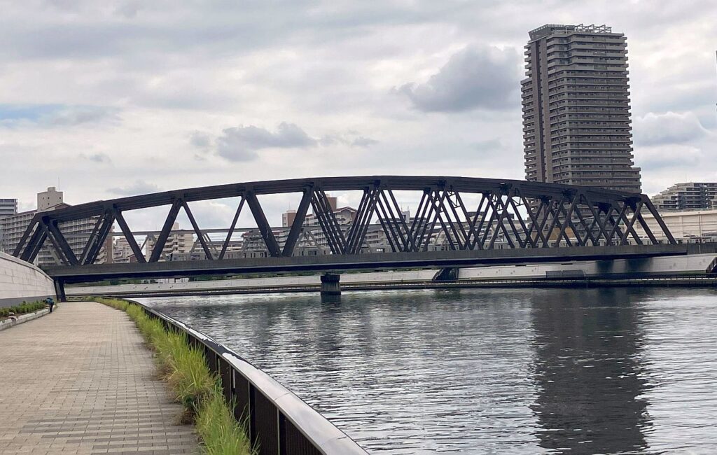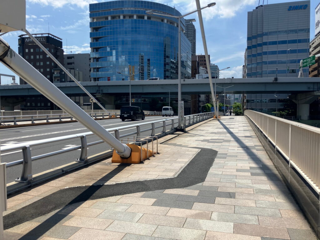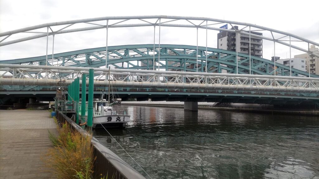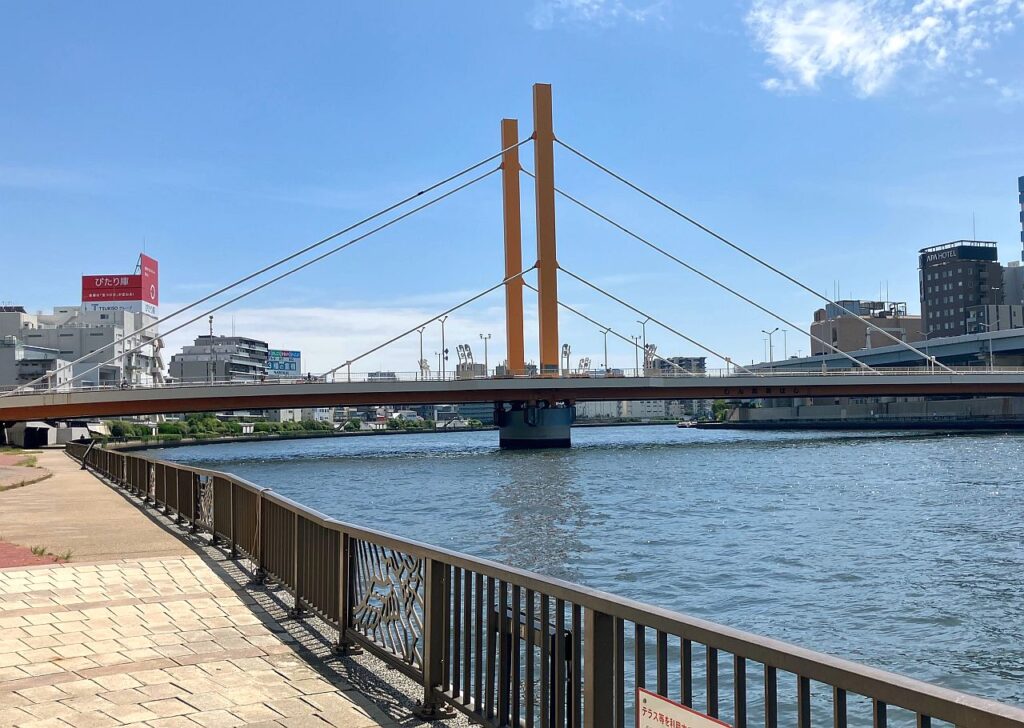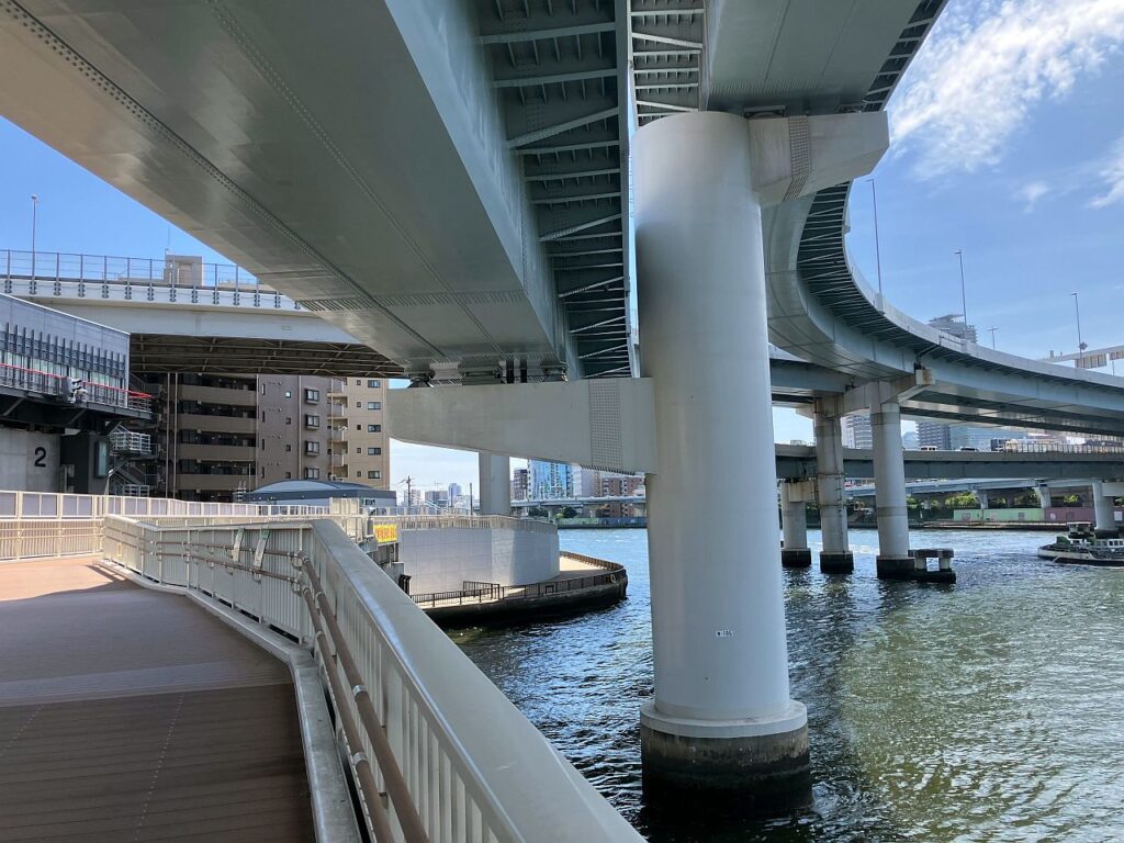総武線鉄橋をくぐり両国橋を過ぎると、首都高6号線が隅田川を渡る場所となります。左岸をあるくと、左側から堅川が流れ込んでくる地点で、Googleマップ上はテラスが途切れていますが、実際には堅川水門を渡る連絡橋(堅川水門テラス連絡橋)が設置されています。その連絡橋を使い、さらに左岸側のテラスを進みます。