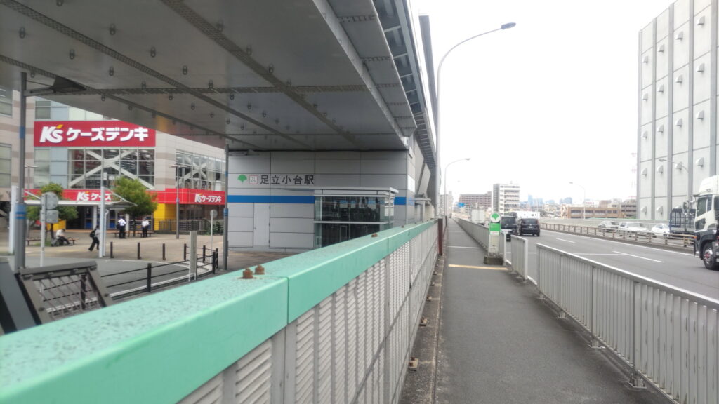 隅田川沿いの歩道を進むと次は小台橋。この橋が信号待ちが必要な場所の2か所目です。 この先は再びテラス区間になるのですが、尾久橋の先で左岸のテラスは途切れてしまいますので、尾久橋で右岸側に渡ります。尾久橋は日暮里舎人ライナーの橋も併設されており、一旦尾久橋をくぐってから、舎人ライナーの足立小台駅を回り込むようにすると尾久橋の歩道に上がることができます。