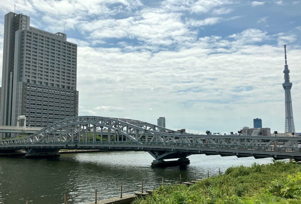 という理由で、今回は吾妻橋で再び左岸に渡り、左岸側のテラスで河口を目指します。下流域になってきて橋の数も増えてきます。