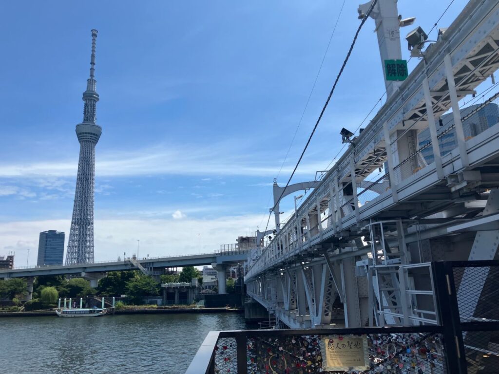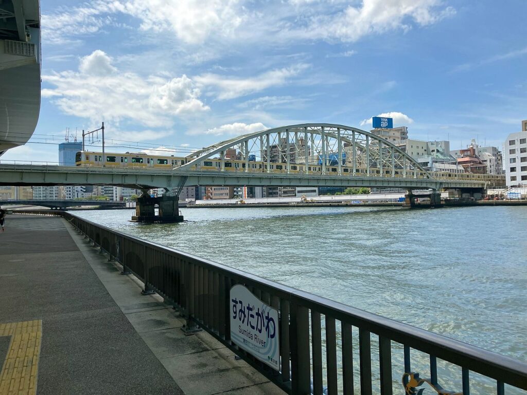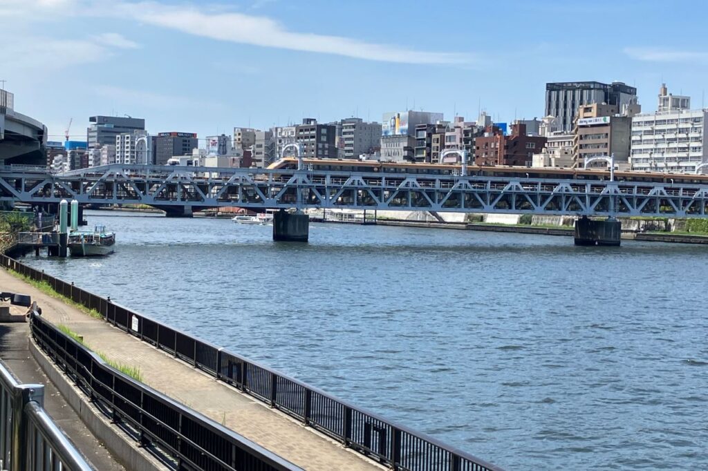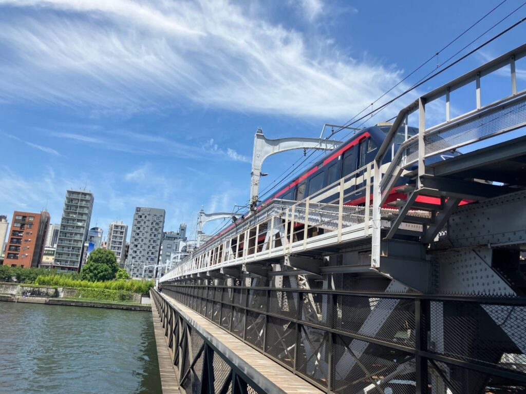 「すみだリバーウォーク」は東武線の鉄橋の脇を歩けるように整備された歩行者専用の橋です。列車のすぐ隣を歩くという迫力ある区間です。