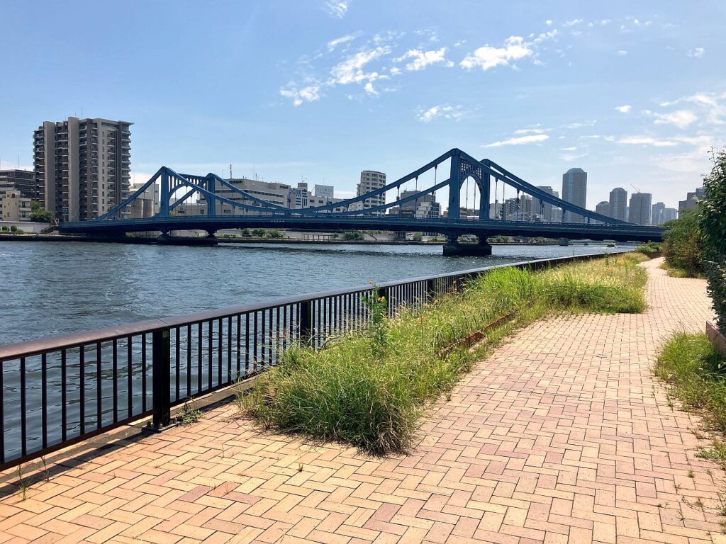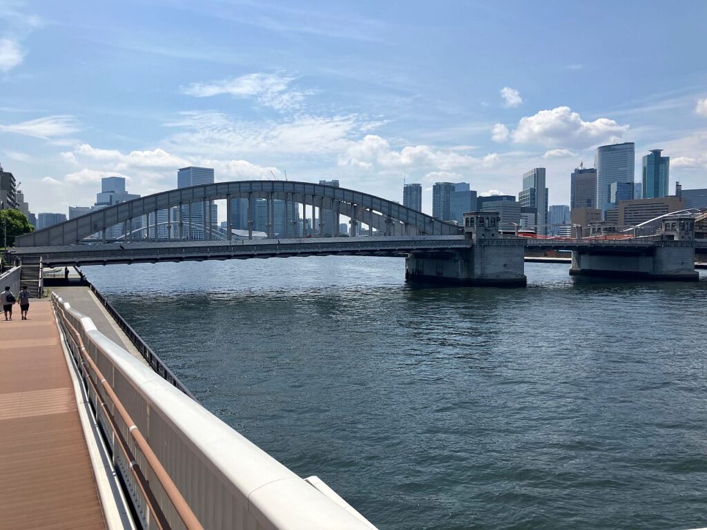 中央大橋から築地大橋までの左岸側も、Googleマップ上は一部テラスが途切れているように見えたり、橋がくぐれないように思える場所がありますが、築地大橋手前のわずかな区間を除いては左岸側を隅田川に沿って歩くことができます。