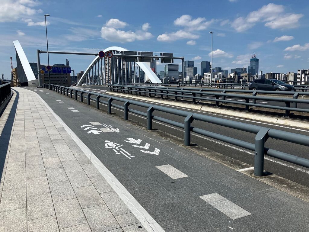 尾久橋を渡り切り、階段を使って橋から降りると一般車道にでます。ここから再び隅田川沿いに戻るまでの200mほどの区間は歩道がありませんので要注意区間。隅田川の土手に戻ると、右岸側にテラスが整備された場所になるので、テラスを次の尾竹橋まで進みます。尾竹橋から先は、再び左岸側が比較的歩道が整備された区間となりますので、尾竹橋でまた左岸に渡りなおします。